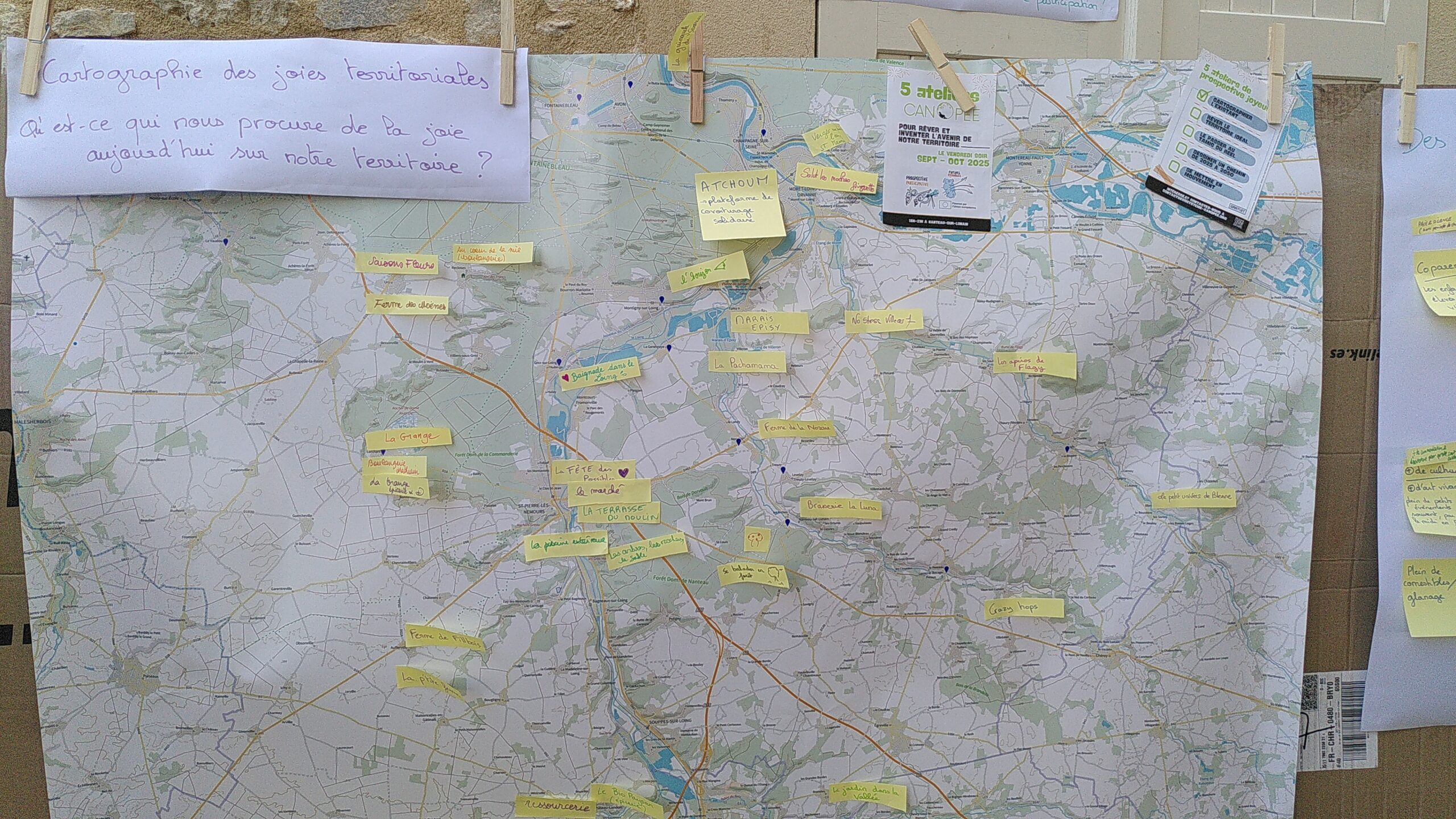 Hier, à la Fête des possibles de Nemours, nous avons expérimenté un atelier de prospective participative « debout ». Installés autour d’une grande carte du territoire, nous avons invité les passant·e·s à s’arrêter, post-its en main, pour partager ce qui les réjouit ici, ce qui les freinerait à rester, et leurs envies ou rêves pour l’avenir.